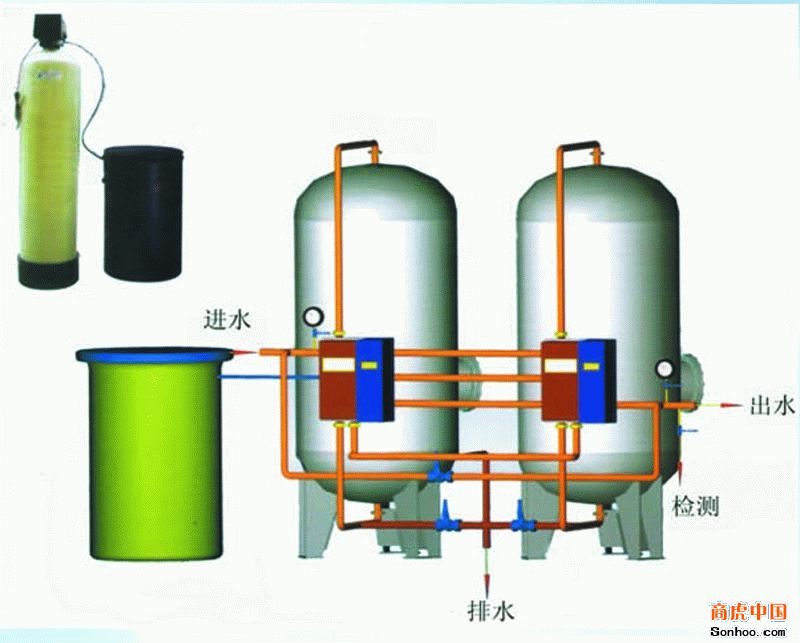 軟化,顧名思義即降低水的硬度。軟化水系統(tǒng)包括三部分,即離子交換部分、鹽再生部分和控制部分。離子交換技術(shù)是軟化系統(tǒng)的工作原理,它的主體是離子交換樹脂,由于水的硬度主要由鈣、鎂形成及表示,故一般采用陽(yáng)離子交換樹脂,將水中的Ca2+、Mg2+(形成水垢的主要成份)置換出來(lái),隨著樹脂內(nèi)Ca2+、Mg2+的增加,樹脂去除Ca2+、Mg2+的效能逐漸降低。因此,當(dāng)軟化水設(shè)備使用一段時(shí)間后,需用鹽再生部分對(duì)樹脂進(jìn)行再生處理,恢復(fù)樹脂的效能,提高樹脂的使用壽命?刂撇糠挚蓪(shí)現(xiàn)整套系統(tǒng)的自動(dòng)運(yùn)行,根據(jù)系統(tǒng)的運(yùn)行時(shí)間或通過(guò)水量來(lái)自動(dòng)進(jìn)行鹽再生。